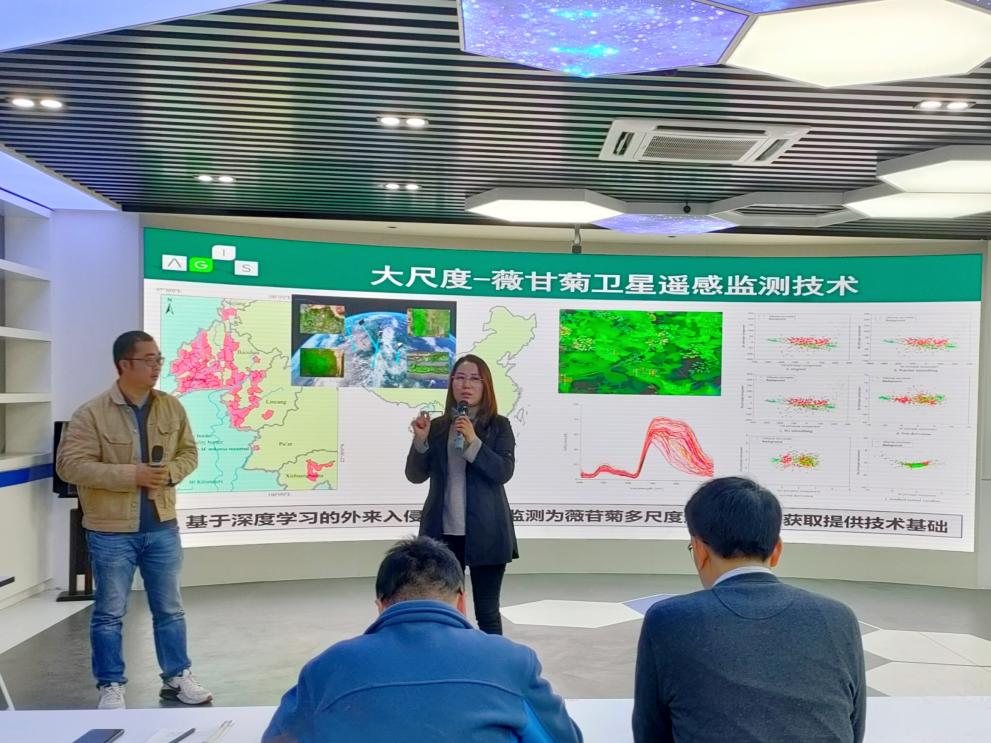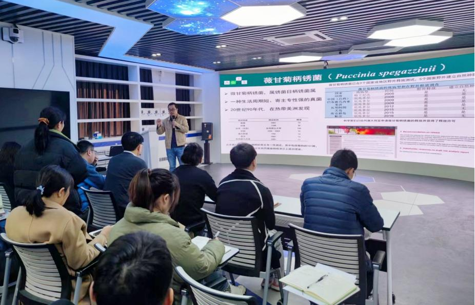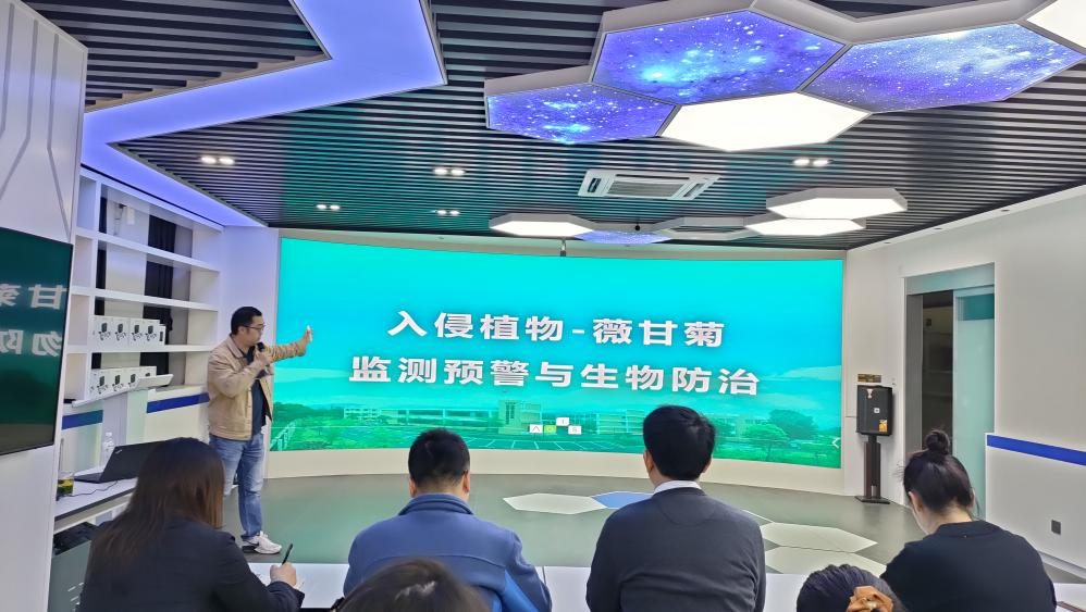 报告中,刘博副研究员从生物入侵、危害及基因组时代、后基因组时代的创新技术与新方法等方面讲起,介绍了1000种入侵生物生物多组学研究计划,之后详细讲解了华南地区危害比较严重的入侵植物——薇甘菊的监测预警与生物防治,从薇甘菊智能检测、快熟生长机制、生物防治三方面汇报了此研究的研究思路与研究进展。报告结束后,刘博副研究员与师生进行了进一步的讨论交流,并对大家提出的问题进行了耐心细致的解答。