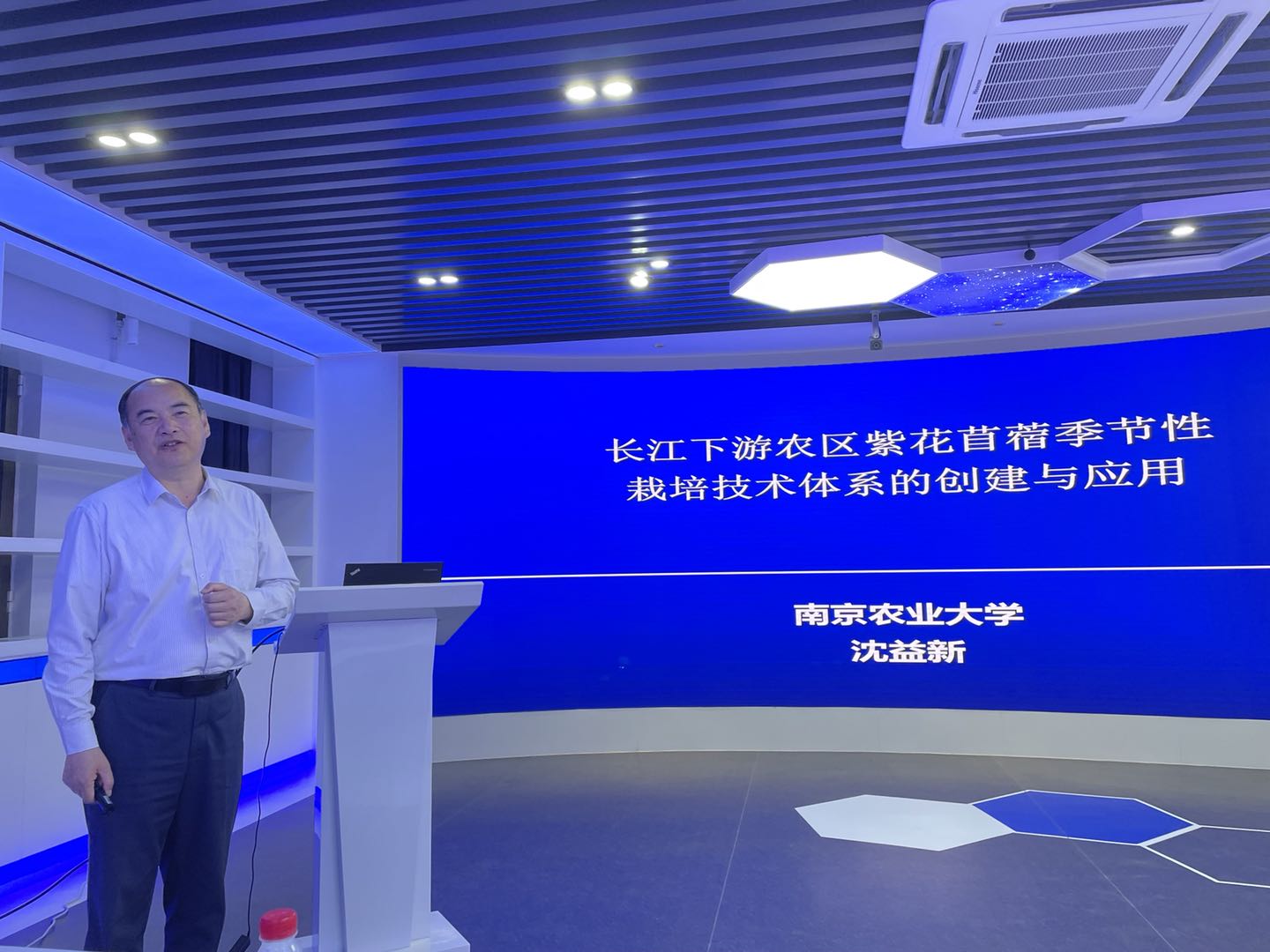 沈益新教授作了题为“长江下游农区紫花苜蓿季节性栽培技术体系的创建与应用”的学术报告。沈老师首先向大家介绍了长江中下游农区畜牧业的发展现状,以及对优质紫花苜蓿的迫切需求情况,但长江中下游农区夏季高温多雨,土壤板结酸化等环境非常不利于紫花苜蓿传统种植模式的推广。针对上述问题,沈老师系统介绍了团队十几年潜心研究的成果,发现秋季(9月底-10月上中旬)进行紫花苜蓿播种,来春季收获2-3茬的紫花苜蓿饲草的季节性栽培模式,能够克服不利环境因素的影响,且饲草产量和品质均较好。此外,团队经过多年实践,在紫花苜蓿品种选择、施肥、灌溉、刈割频度和高度等重要生产管理要素中进行了深入研究,最终探索出了适应于长江中下游农区的紫花苜蓿栽培新模式,目前已推广面积超6000亩,弥补了该地区紫花苜蓿种植管理技术的空白。最后,沈老师对beat365草业人才的培养寄予了厚望,鼓励beat365亚洲体育官方网站本科生积极报考南京农业大学beat365亚洲体育官方网站。