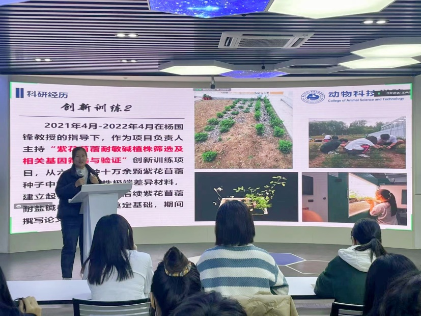 2022年国家级奖学金获得者王奇讲述了她利用课余时间,参与老员工创新创业训练计划项目过程中筛选出多棵珍贵紫花苜蓿株系,并以共同作者在二区SCI期刊BMC genetics发表论文的经历,鼓励同学们要在保证学习成绩优秀的基础上,将理论知识与专业实践相结合,积极参与科学研究和社会实践,明确自己的学习目标,抓住当下时机,脚踏实地,坚持自己所向,成就更好的自己。