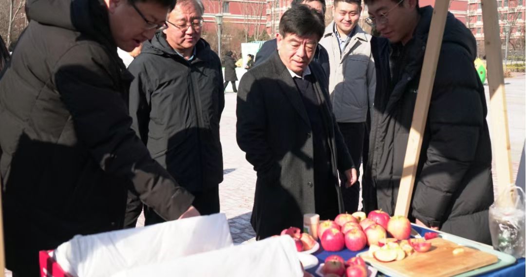 随后,田义轲一行参观了不同展区,品鉴地瓜、花生、苹果等科研成果,观赏制作精美的昆虫标本和植物标本,详细向现场同学们了解相关学术科研成果、作品制作过程等,鼓励同学们坚定文化自信、树立专业信心,争做“学农爱农”的新时代“三农”人。