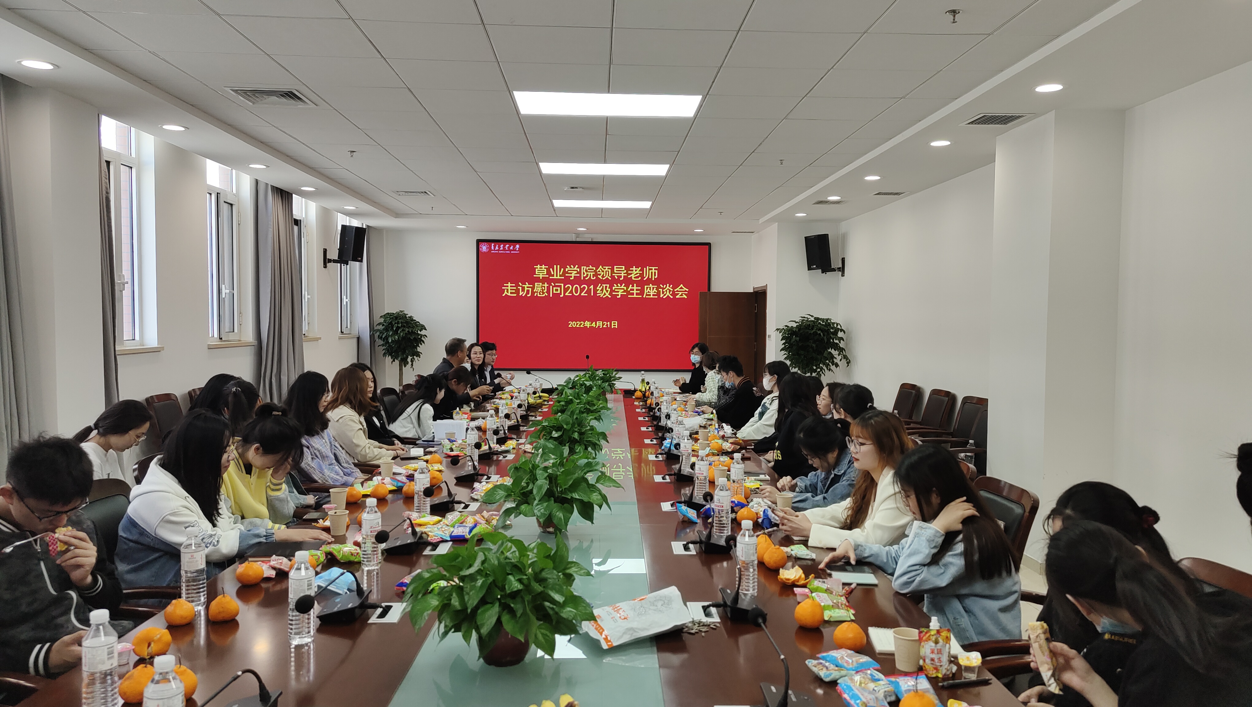 4月21日上午,beat365亚洲体育官方网站在平度校区明德楼会议室召开了“公司领导老师走访慰问2021级员工座谈会”。公司党总支书记乔磊,副书记、副经理翟崑,副经理孙娟,辅导员、班主任、教学秘书老师以及全体2021级本科生参加座谈。