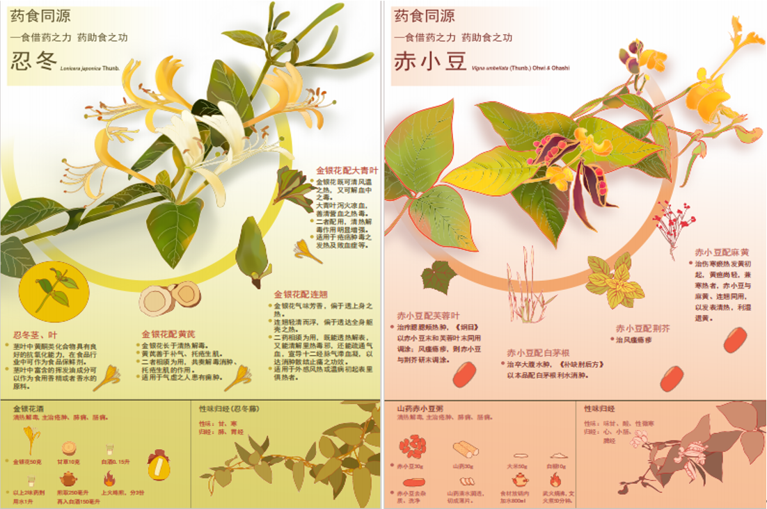 作品简介:《药食同源》是关于科普清热类——中草药主要价值的系列插图设计。该系列作品利用图文结合的设计方式来提高阅读效率和信息传递效果,为广大老百姓科普正确的草药价值,宣传“药食同源”理念,加强公众养生健康。