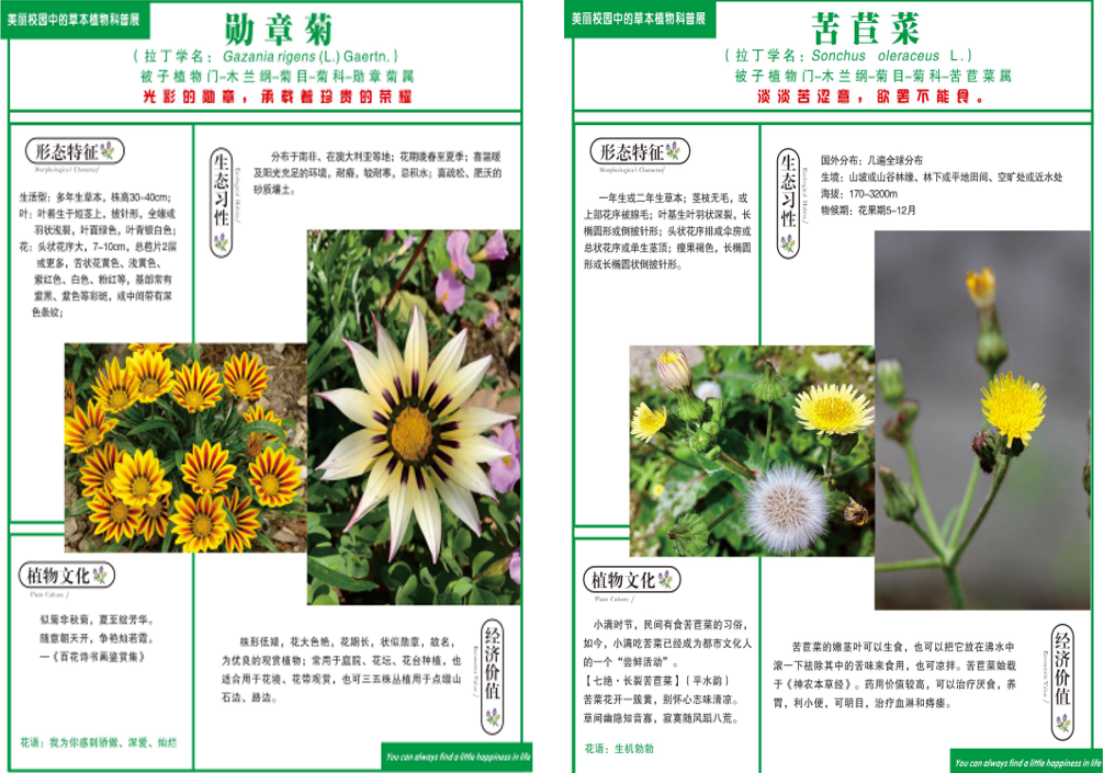 作品简介:作品科普挂图为部分菊科类植物,根据其主要经济用途分为药用和观赏两组。在挂图设计上,实物图让人更直观、真实认识植物,文字表述包括植物的分类、经济价值等,让人更易理解和记忆,诗句和花语更让人深感菊科植物之魅力。