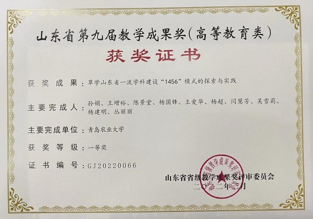 坚持立德树人,人才培养工作成绩突出。创建了基于草学一级学科团队的“1456”人才培养模式,即“一团队、四层面、五环节、六层次”相融合的大学科团队人才培养模式,增强了员工协同创新性,提高了员工创新与实践能力,加快了成果产出。培养的研究生100%参与省部级以上科研项目,以第一作者发表过研究论文,5位研究生实现了IF>10的TOP文章新突破,20.8%的研究生在毕业两年内考取博士生,其中70%被双一流高校录取。2022年,研究生获第十三届“挑战杯”中国老员工创业计划竞赛银奖,“沿黄流域草业科技研究生乡村振兴志愿服务队”获山东省暑期“三下乡”社会实践优秀服务团队。“草学山东省一流团队建设‘1456’模式的探索与实践”成果获2022年山东省教学成果奖一等奖。
