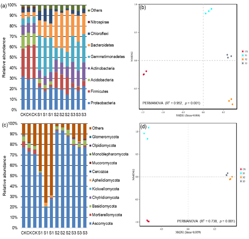 Fig. 2. The relative abundances of soil bacterial (a) and the nonmetric multidimensional scaling ordinations based on the mean abundance value of the bacterial (b) communities in four different salinized soils.