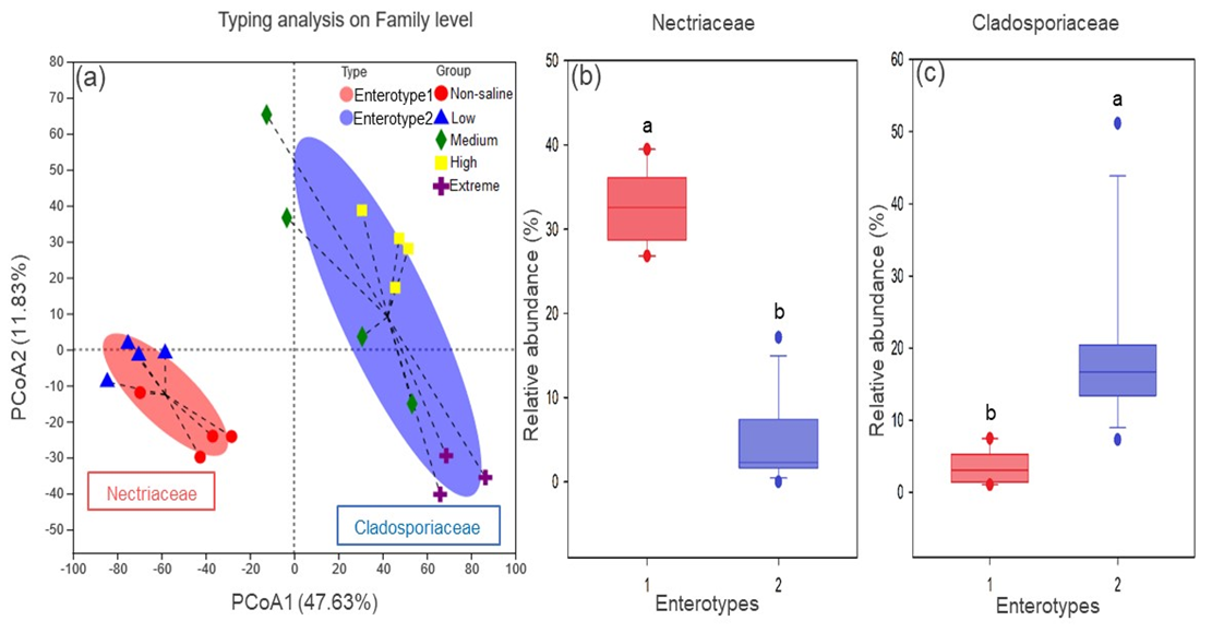 Fig. 3. The enterotype analysis for five different salinized soils: (a) the clustering on the first two principal components, and the proportions of fungal taxa characteristic of (b) Nectriaceae and (c) Cladosporiaceae.