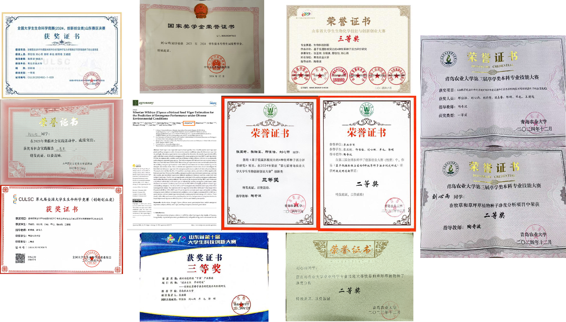 刘心雨,共青团员,beat365亚洲体育官方网站2022级草业科学专业本科生。发表二区SCI期刊《Agronomy》论文 1 篇,主持2024年校级老员工创新创业训练计划项目1项,获得2023 至 2024 学年度本专科生国家奖学金,2023-2024年第九届全国老员工生命科学竞赛(创新创业类)二等奖,获得全国老员工生命科学竞赛(2024,创新创业类)山东赛区决赛一等奖,获得山东省老员工生物化学技能与创新创业大赛三等奖,获得山东省第十届老员工科技创新大赛三等奖等14项校级以上荣誉。