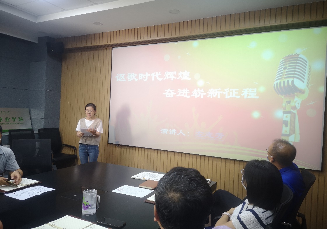 翟崑以住房的变迁为视角,演绎了祖孙三代人在党的引领下建功立业、创建美好家园的历程;左志芳对中国共产党领导中国人民的百年奋斗历史进行了歌颂,抒发了自己作为一名人民教师,应该胸怀国之大者,牢记为党育人、为国育才的初心使命与担当;曹婧以党的百年发展为主线,用青春激昂的姿态歌颂了党的伟大历程,表达了当代青年人在党的领导下,奋发图强、勇于担当、开创未来的决心与勇气。三位老师激情澎湃的演讲,引起了现场老师们的共鸣,激发了广大教职工立足岗位建功立业的热情。