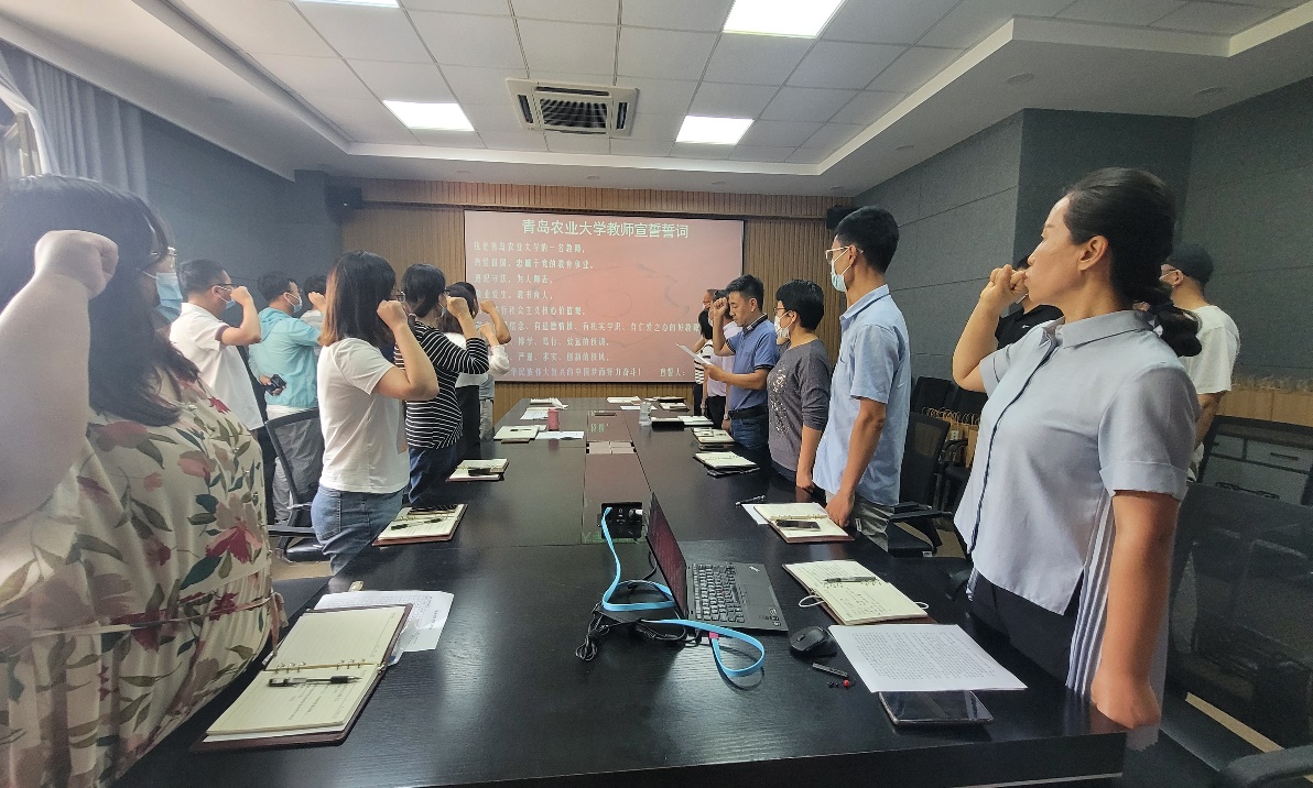 在郭彦军教授的领誓下,全体教职工庄严宣誓要“热爱祖国,忠诚于党的教育事业,遵纪守法,为人师表,敬业爱生,教书育人,自觉践行社会主义核心价值观,做有理想信念、有道德情操、有扎实学识、有仁爱之心的好教师,秉持厚德、博学、笃行、致远的校训,弘扬勤奋、严谨、求实、创新的校风,为实现中华民族伟大复兴的中国梦而努力奋斗”。