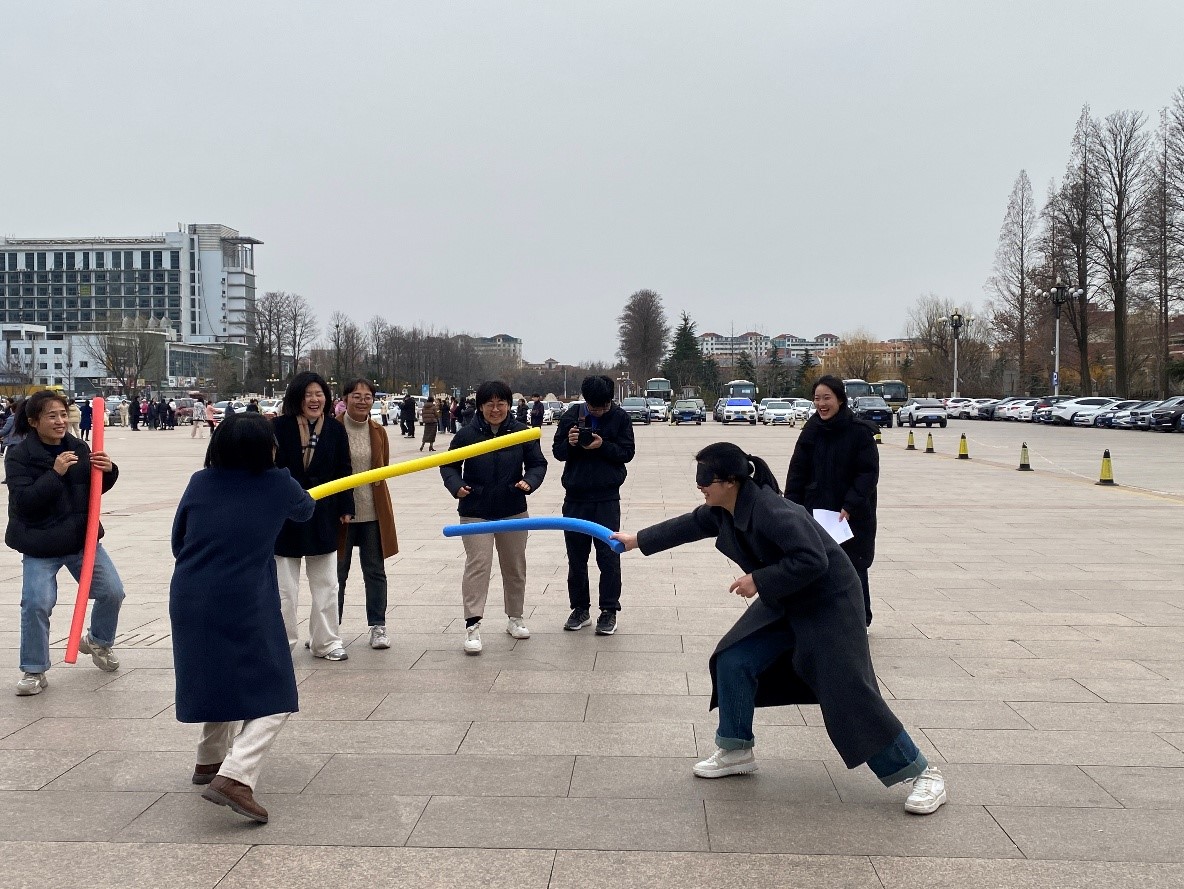 在“蒙眼互打”环节,老师们眼睛蒙罩,手持充气棒,原地转三圈后,从限定区域内摸索前进,大家在队友的引导下展开激烈角逐,在攻防之间尽显智慧与勇气。现场加油声此起彼伏,欢笑声不绝于耳。