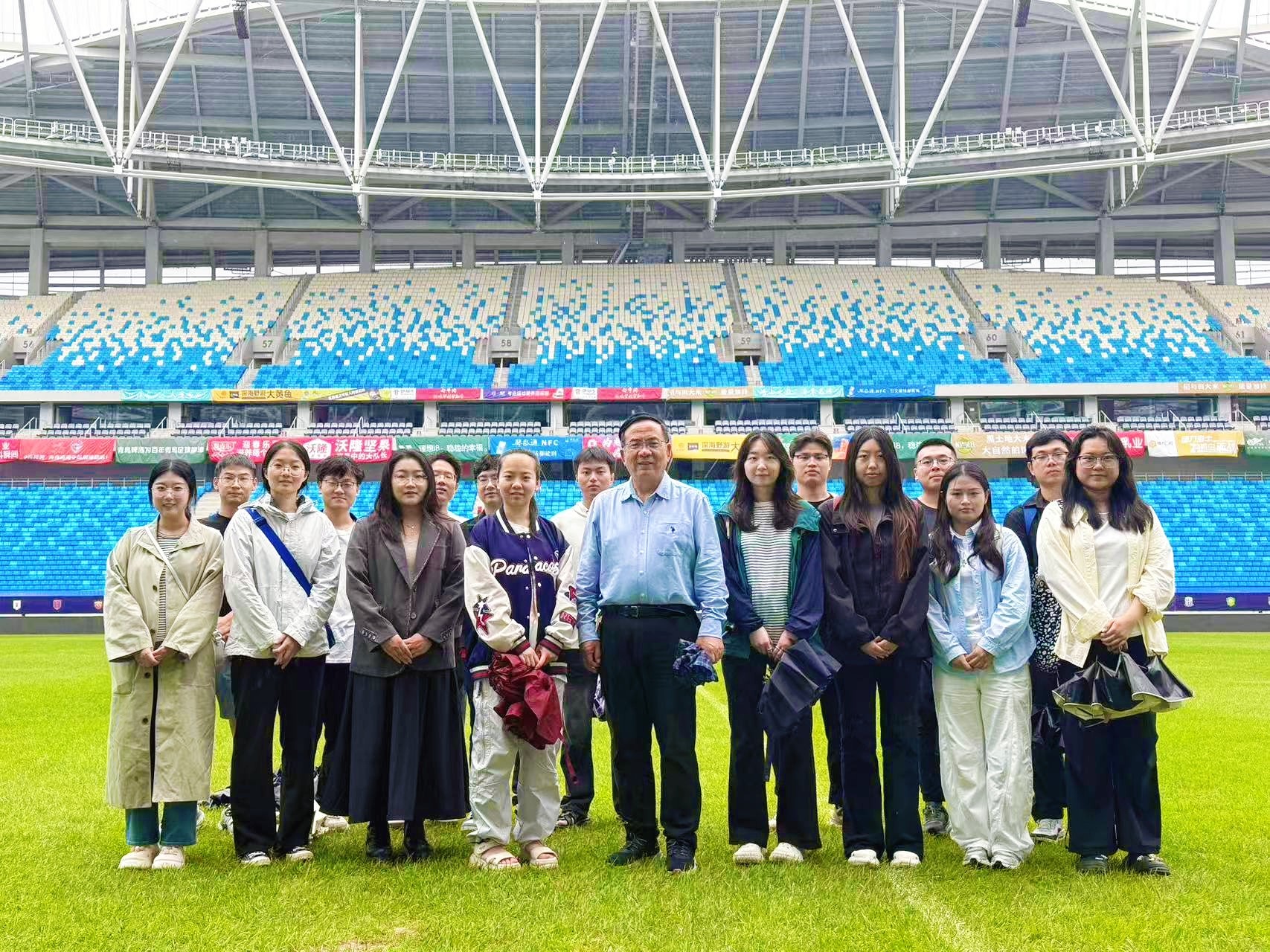 在青岛青春足球场,养护团队负责人介绍了建植要点:“这里采用高羊茅与早熟禾混播,既耐践踏,又具有较强的抗病性,能够满足高强度赛事需求。”场地底层铺设人造草丝并填充河沙,结合 95% 天然草的锚固草技术,有效提升了渗水性与草根保护,并延长了草坪寿命。员工们蹲身观察草坪结构,认真记录养护细节,还现场体验了地暖、补光和刈割设备的应用。大家认为,课堂上讲授的“环境调控与草种适配性”,在这里得到了最直观的印证。